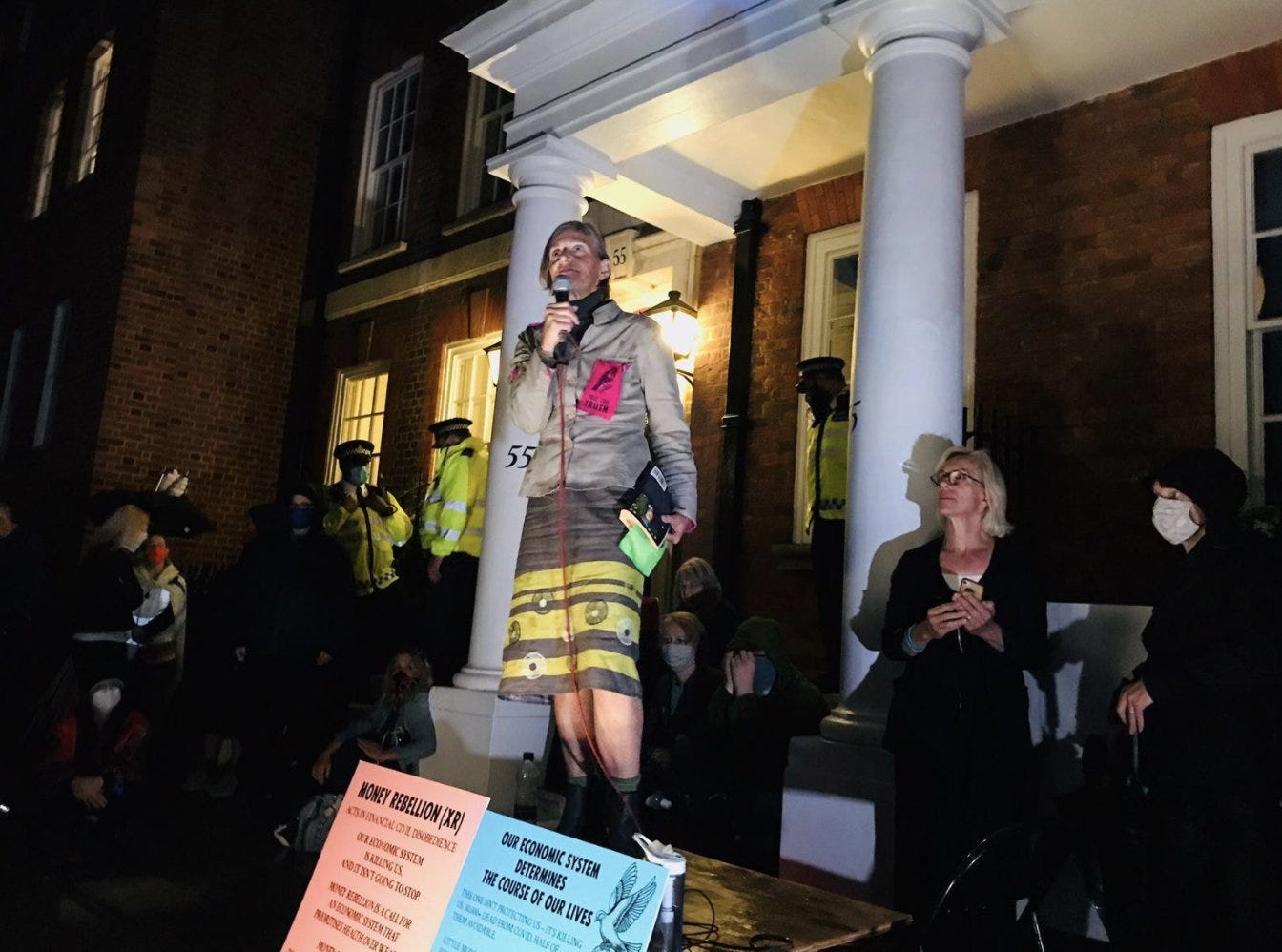 I don’t know exactly what I am going to say in these few minutes but I do want to say why it matters that writers rebel, not only as individuals, but together – as we are here on this night in post-lockdown London: 20 of us holding scripts and books in our hands, reading poetry and fiery statements out loud with a police helicopter whirling above our heads. Who else can challenge the dangerous fiction, constructed behind these doors, and change the plot mid-sentence?