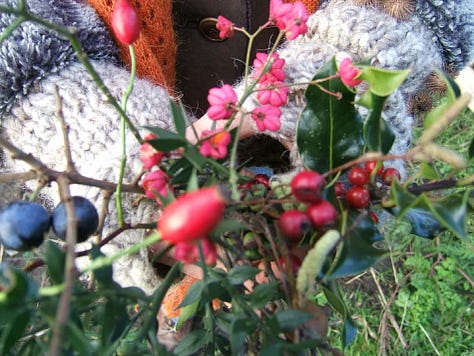 I don’t know what got into me. I am not rude or commandeering by nature. But I have no patience for alien conspiracy theories, especially ones that drag everyone’s energy down, and suddenly I’d had enough of this blah-blah spiritual clap-trap. Humphrey kept yelling for us to leave and I kept quoting back what he had said about love. The others kept quiet. Finally Humphrey closed the door and came to sit down. Normally other people’s anger makes me shake and tremble, but I felt calm, collected, razor sharp. In that moment of clarity I remembered I had picked the holly before I had come out.