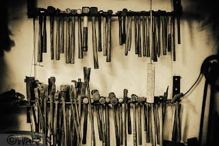 Sometimes you think you follow the wrong god home, and sometimes you know you have no choice. Wayland is the lamed blacksmith of the Saxon pantheon and forger of the famous dragon-killing swords wielded by Beowulf and Siegfried. He is not the kind of mythical being you would necessarily choose to go on a journey with. He is not an elegant Minoan goddess in a beehive skirt, nor a heroic Greek warrior, nor an exciting blue-faced deity with eight arms standing on top of a tortoise. His maker skills do not bestow wisdom and healing powers like the Celtic or classical patronesses of craft, nor does he promise Hadean transformation or ecstasy. He is a blacksmith who kills boys and eats bears. Like Vulcan and other mythical lamed smiths, he is very rough and very gruff.