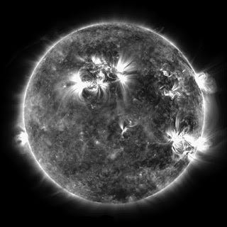 At first you see only a red globe that feels shockingly near. But on a second glance you notice the black sunspots and the flares on the edges of the sphere. You realise that the sun is not this round static disc that brings you warmth and light that you take for granted. It is the fire that smelts life. You expect it to be calm and cool like the far distant stars, or Jupiter or the moon. But it isn’t: it is a raging furnace, stoked to the max.