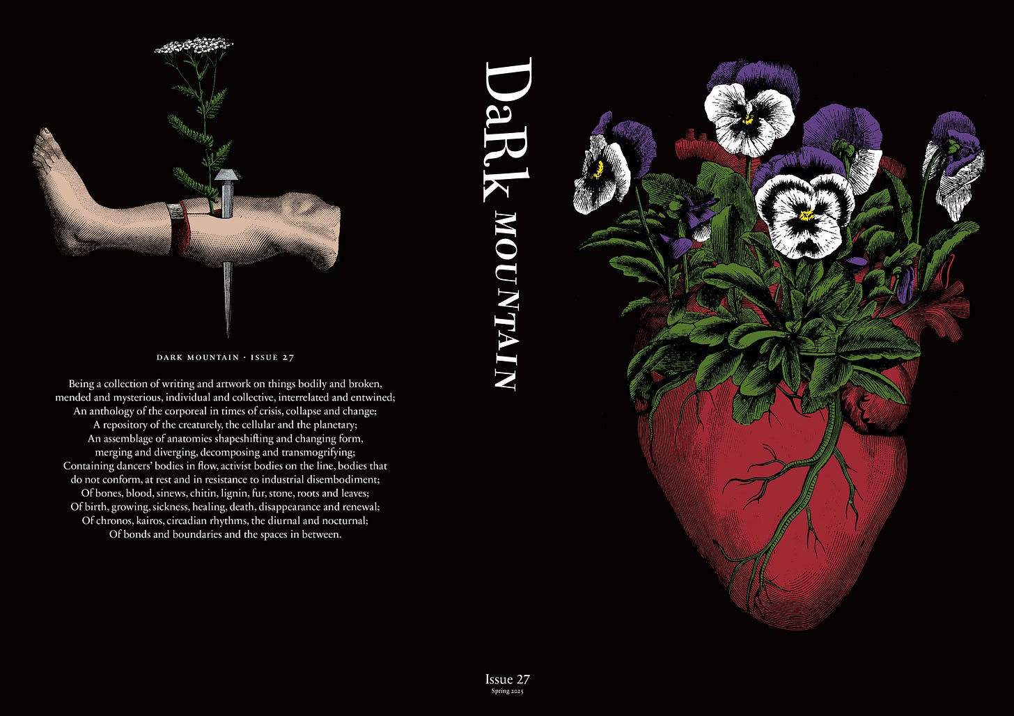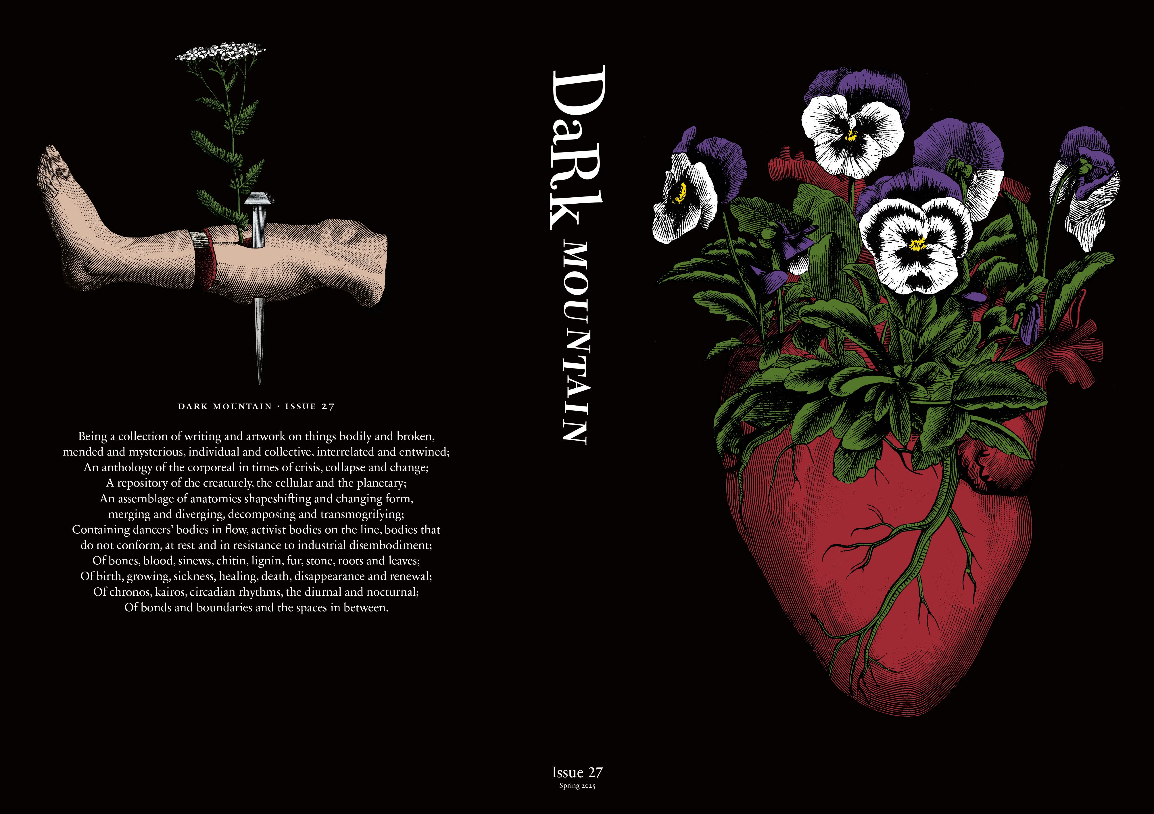 today. It’s the latest Dark Mountain issue, a classic hardback spring anthology on all things bodily and broken, mended and mysterious, individual and collective, interrelated and entwined …You can read all about it in our introduction, and come to the online launch next Wednesday 23rd April. Eventbrite bookings for that can be made here. In between readings about life, death and creaturehood, I will be hosting an art show of some of works in the book, including this elegant and visceral cover by Alice Smith of Bracketpress, our long-time brilliant typesetters. Hope to see you there!